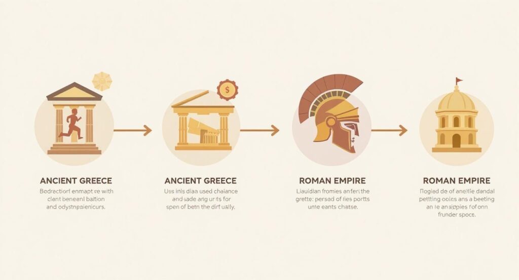 As the infographic shows, the core idea of betting on physical contests started with ancient civilizations like the Greeks and was later refined by the Romans, who turned it into a massive spectator event.